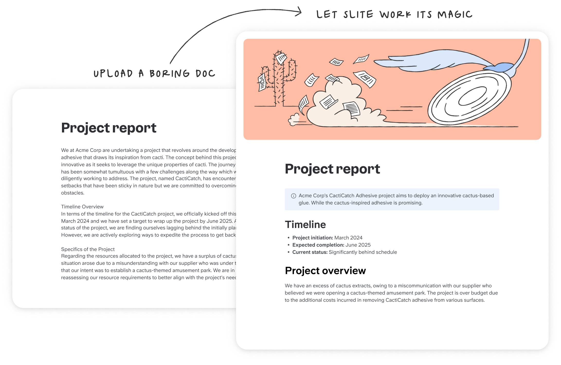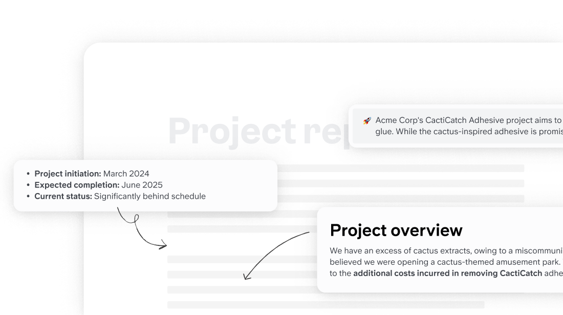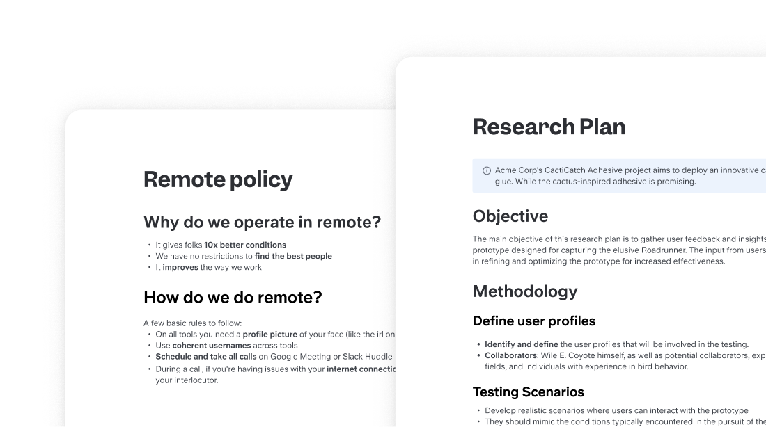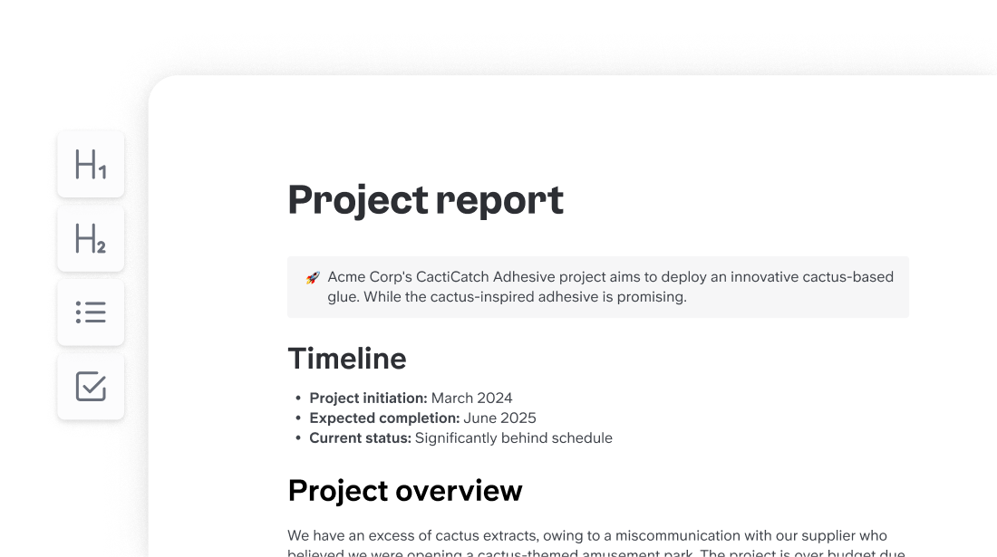 Usa IA para aplicar las mejores prácticas de estructuración a tu escritura, identificando los puntos clave de tu doc y haciéndolos destacar. Tomamos tus palabras y las reorganizamos en plantillas probadas.